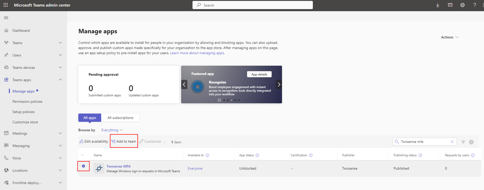 1. Navigate to [Microsoft Teams Manage Apps](https://admin.teams.microsoft.com/policies/manage-apps)