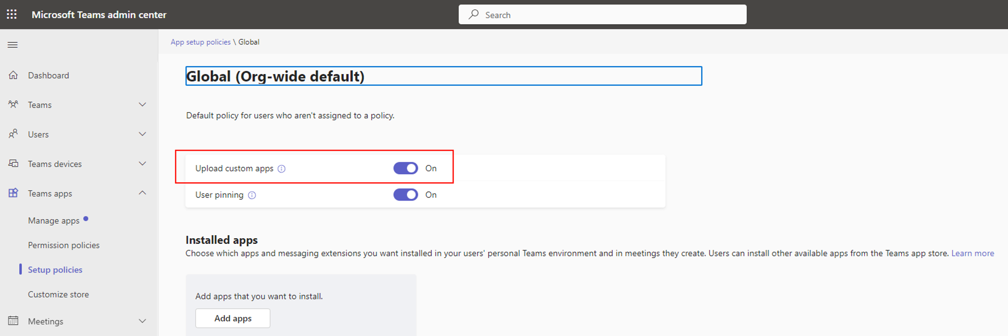 4. Ensure that the **Allow custom apps** option is enabled for users who will use the Twosense MFA bot. For example, if you only have the **Global policy** that applies to all users, it should look like this: