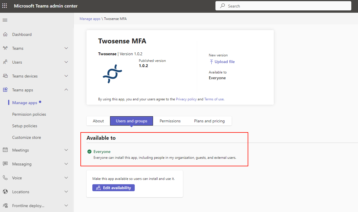 4. Click **Upload** and select the file `TwosenseMsTeamsBot-x.y.z.zip` provided by your Twosense Account Manager.